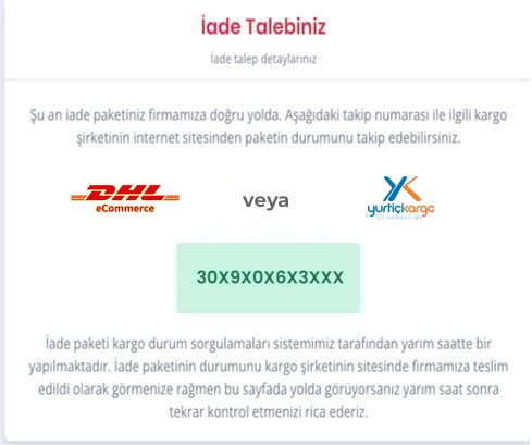 Sistemimiz size bir GERİ GÖNDERİM KODU ve firmamıza ait olan seçtiğiniz kargo şirketindeki MÜŞTERİ NUMARAMIZI verecek. Buranın ekran görüntüsünü almanız iade gönderiminde kolaylık sağlayacaktır. Bu bilgiler ayrıca, SMS olarak da size iletilecektir.